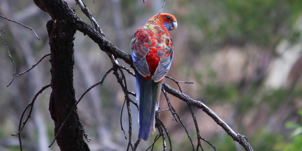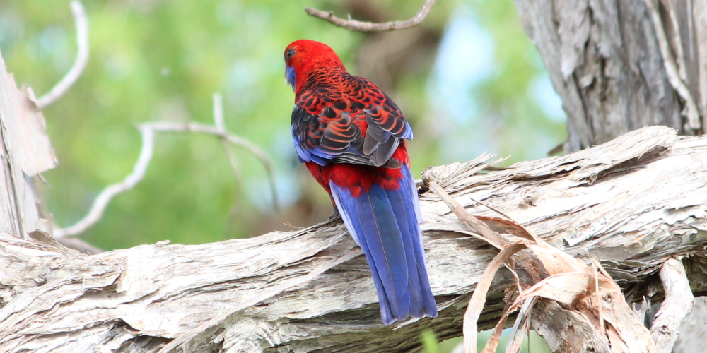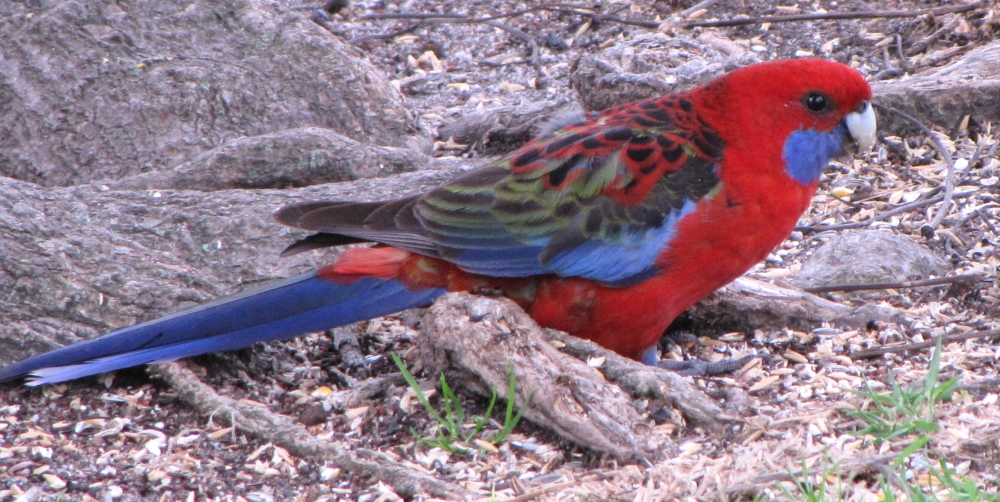 Adult female Crimson Rosellas retain some green-edged back feathers all their lives. They also have a greenish tinge to their tail feathers. Adult males have blue tails, and all their back feathers are black with red edges.