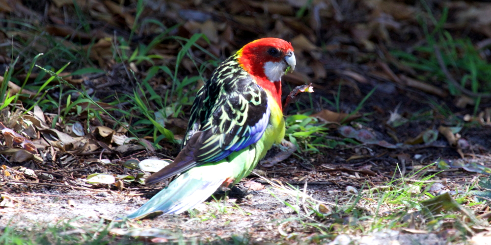 The bird in the picture is a young Crimson Rosella Platycercus elegans.