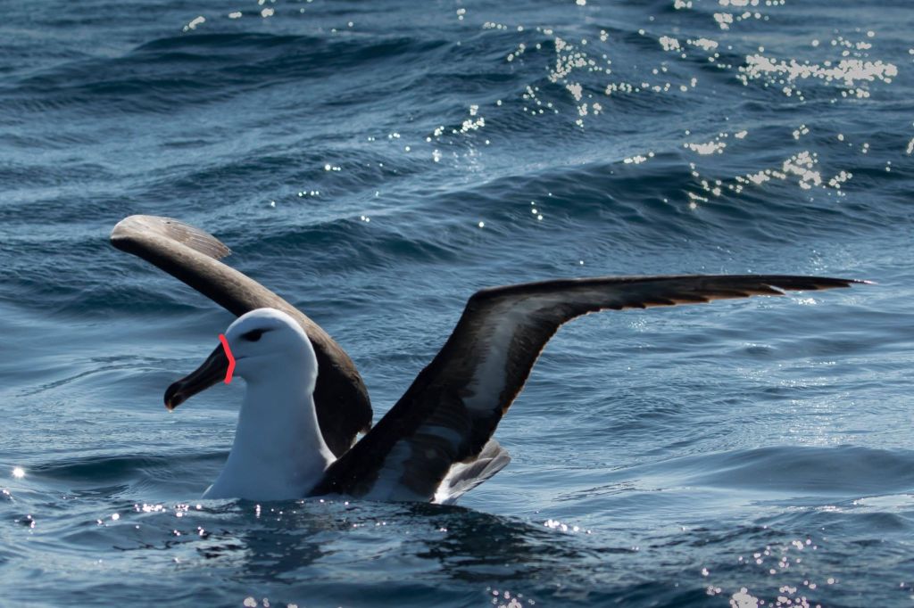 The pink tip to the bill is a bit of a red herring, as it looks like light through the bill, rather than true colour as it would be in an Indian Yellow-nosed albatross (although in an immature IYNA, the pink tip would be much reduced anyway). For the more birdy nerdy among us, the shape of the base of the bill, where it meets the head, is angled, rather than vertical as it would be in Indian Yellow-nosed albatross (see photos 3 & 4 below).